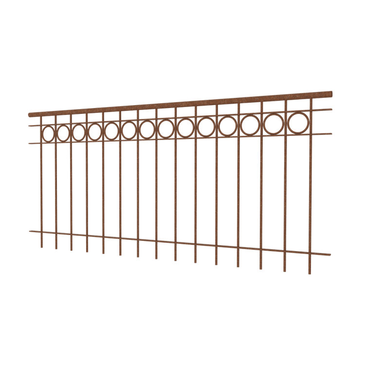 Je Geländerelement verteilen sich 15 Stäbe mit einem Durchmesser von 1,2 cm. Die kreisrunden Elemente besitzen einen Durchmesser von 11,2 cm. Abschluss bildet ein ergonomisch geformter Handlauf mit einem Durchmesser von 3 cm.