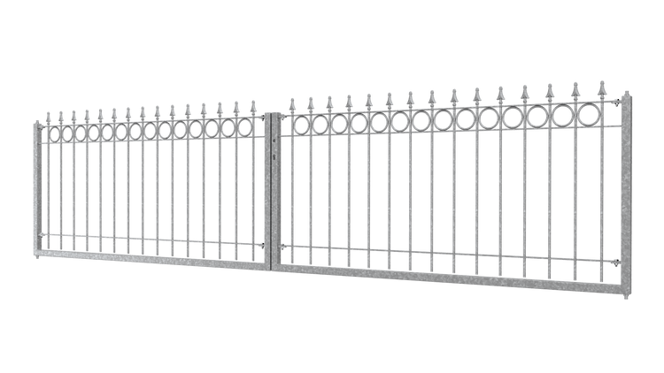 Imposantes Einfahrtstor, das mit klassischer Eleganz und formschönen Details überzeugt: "Belluno" ist aus hochwertigem, witterungsbeständigem Schmiedeeisen gefertigt. Das große Metall Tor hat eine Gesamthöhe von 90 cm. Die Flügel messen jeweils 200 cm. Außergewöhnliche Hingucker sind die Pinien-Spitzen und die kreisförmigen Ornamente.