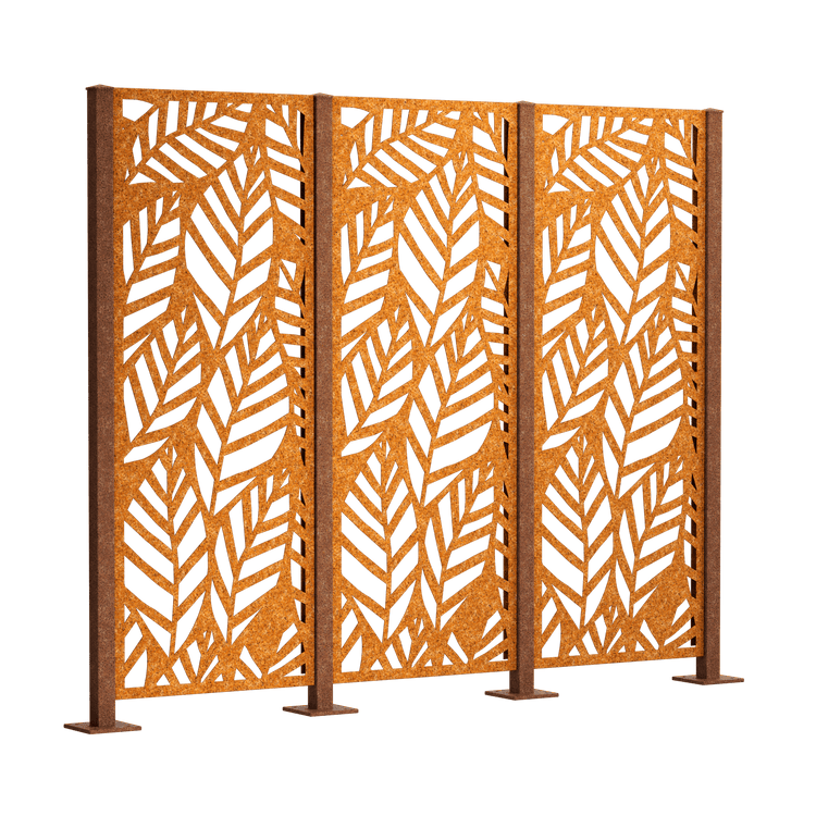 Unser Sichtschutzzaun Komplett-Set "Livenza" ist in einem vollflächigen, aufwendigen Blattdekor gestaltet. Wählen Sie zwischen pulverbeschichtetem Metall (Duplex-Verfahren) oder Cortenstahl. Die Sichtschutzelemente messen einzeln 158 x 60 cm.