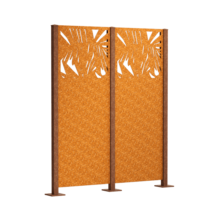 Unser teilflächiges Sichtschutzzaun Komplett-Set "Taro" wird im oberen Teil von abstrakten Palmenblättern geziert. Wählen Sie zwischen pulverbeschichtetem Metall (Duplex-Verfahren) oder Cortenstahl. Die Sichtschutzelemente messen einzeln 158 x 60 cm.