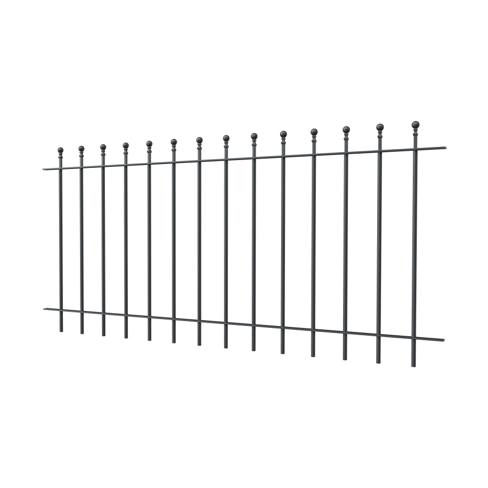 Klassische Eleganz mit formschönen Details: Unser Zaun "Ancona" fügt sich harmonisch in jeden Garten. Hingucker sind die kugelförmigen Spitzen. Der Metall Zaun "Ancona" ist von Hand aus massivem, witterungsbeständigem Schmiedeeisen gefertigt. Pro Zaunelement beträgt die Standardbreite 192,5 cm, die Höhe inklusive Spitzen 90 cm.